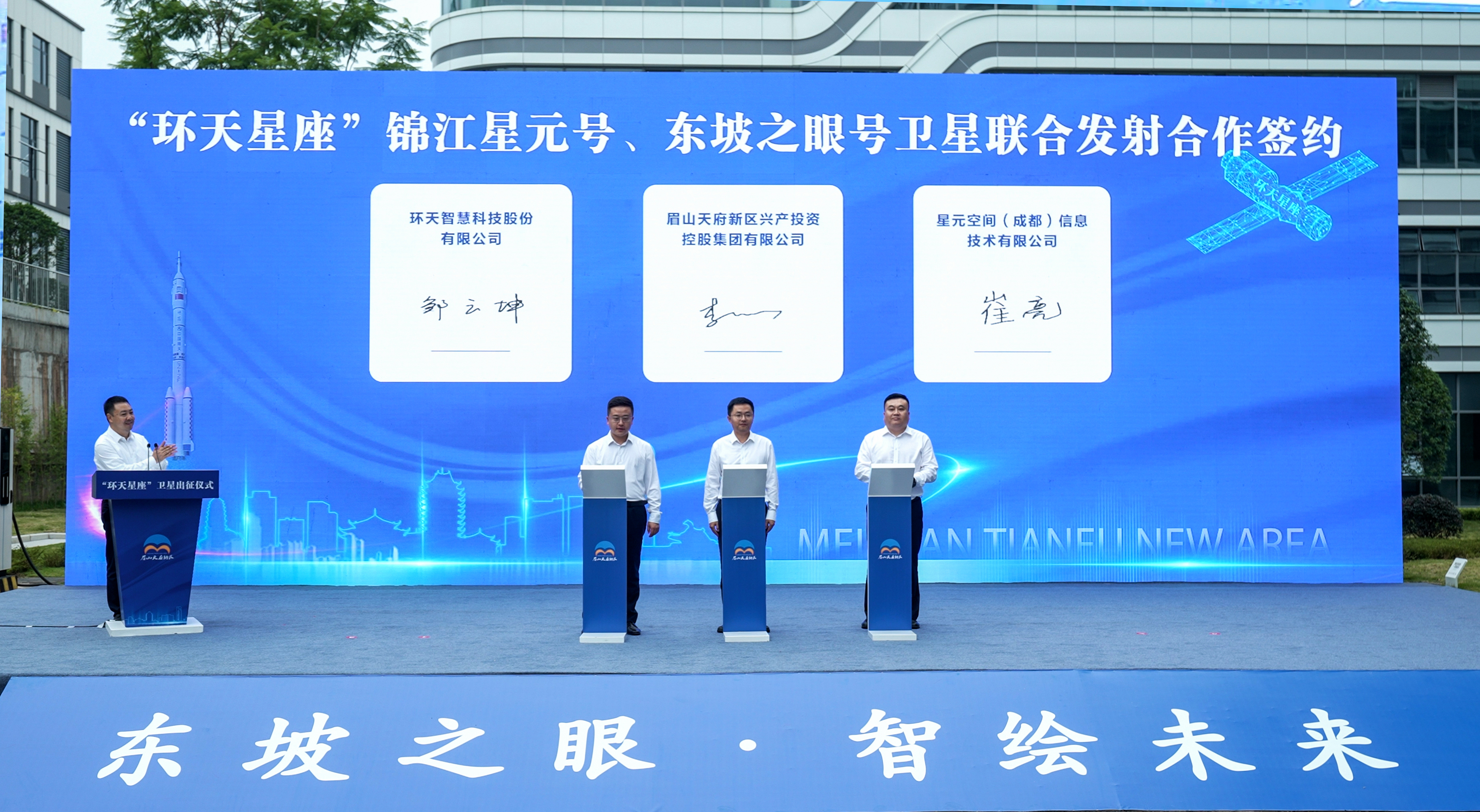 出征仪式现场举行了签约仪式,天府新区眉山兴产投资控股集团与环天智慧,就“东坡之眼号”联合发射签约;星元空间(成都)与环天智慧,就“锦江星元号”联合发射签约。