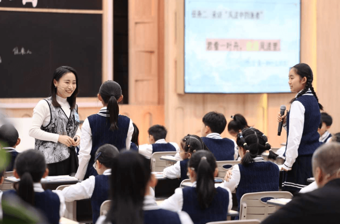 岑宇君老师和学生们一起穿越南宋,执教五年级下册《稚子弄冰》,以具身学习为理念,从甲骨文 “弄” 字的本义解读开篇,让学生动手体验“弄冰”的场景,在画面想象、节奏朗读中感受冰块破碎的意外之趣,解锁杨万里 “有声有色、有情有趣” 的诗风密码,让宋代古诗的童真童趣跃然于课堂之上。