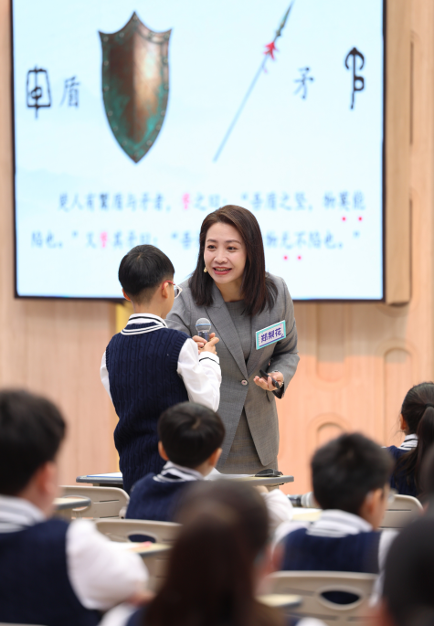 来自深圳南山外国语学校香山里小学的郑梨花老师直面教学难点,带来五年级下册《自相矛盾》,以先秦寓言为切入点,从楚人卖矛与盾的荒诞场景切入,引导学生通过默读批注、重音朗读、情境思辨,在文本解读与互动探讨中领悟 “说话留余地” 的表达智慧,更延伸至《韩非子》原著语境,挖掘寓言背后反驳君主事必躬亲的深层内涵,让学生学会直面矛盾、化解矛盾的思维方式。