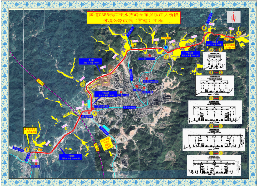 项目起点位于南街水声岭脚赛洞,由东北往西南方向布设,沿国道G355线途经黄盆村、东环路口、改线经苏塘村、星平村、聚和村、城南大道、成发路口,接回国道G355线,经小迳、本策至项目终点东乡绥江大桥路口,全长13.5公里。