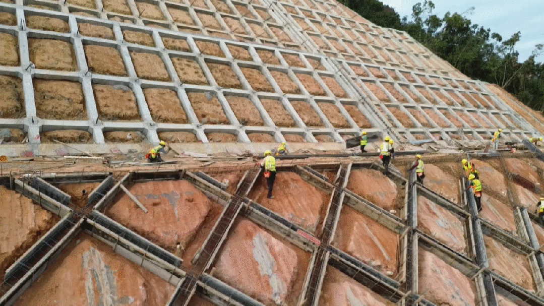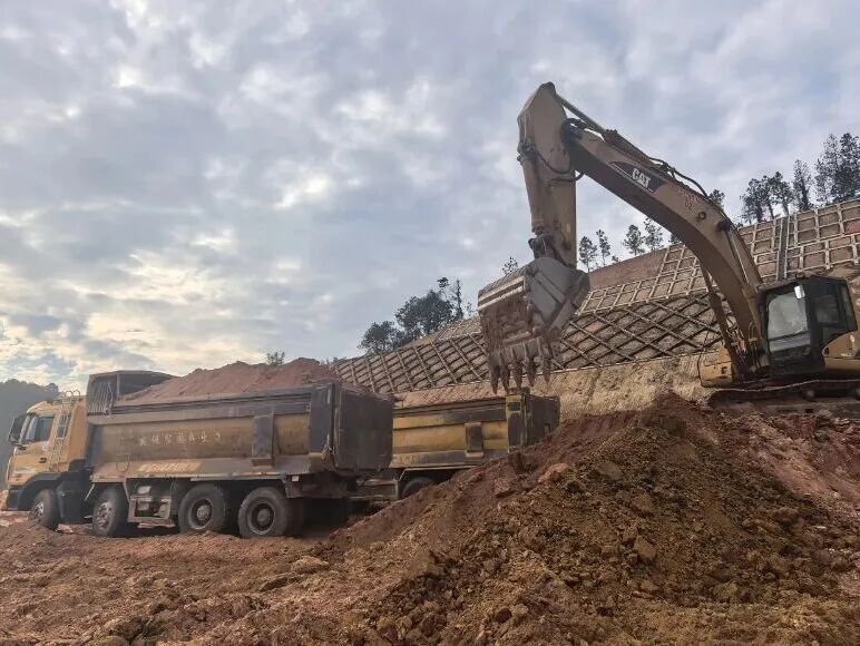 在百盈花园小区至庄前西路施工段,挖掘机挥舞巨臂,一斗斗土方被精准挖起,大型装载车来回穿梭,将一车车土方和建筑材料运送到指定地点。工人们则在山坡上紧锣密鼓地进行混凝土挡土墙的修筑,他们各司其职,紧密配合,共同推动着北环路建设的稳步前进。