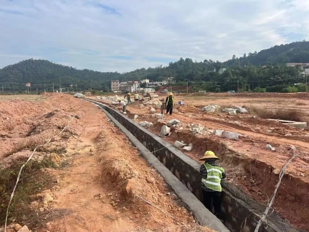 走进柯木二桥至百盈花园小区施工段,机器的轰鸣声和工人们的呼喊声交织在一起,构成了一幅生动的建设画卷。只见施工人员正忙而有序地进行路面混凝土浇筑以及雨水管道铺设,同时,在施工区域的边缘,一座高大的混凝土挡土墙正在拔地而起,现场一片繁忙而有序的景象。